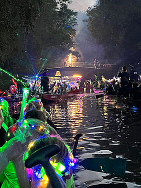 Die Regatta startete traditionell am Freitag mit der abendlichen Lampionfahrt, ein Bootskorso durch die Grachten von Emden. Unser Drachenboot mussten wir dann auch nicht selbst nach Emden kutschieren, der Ruderverein Emden stellte uns spontan eines seiner Dachenboote zur Verfügug. Wir konnten es kurz nach unserer der Ankunft auf dem Gelände des Rudervereins zu Wasser lassen und zum Regattagelände paddeln. Vor Ort schmückten wir es mit der mitgebrachten Dekoration und reihten uns in den Korso ein.